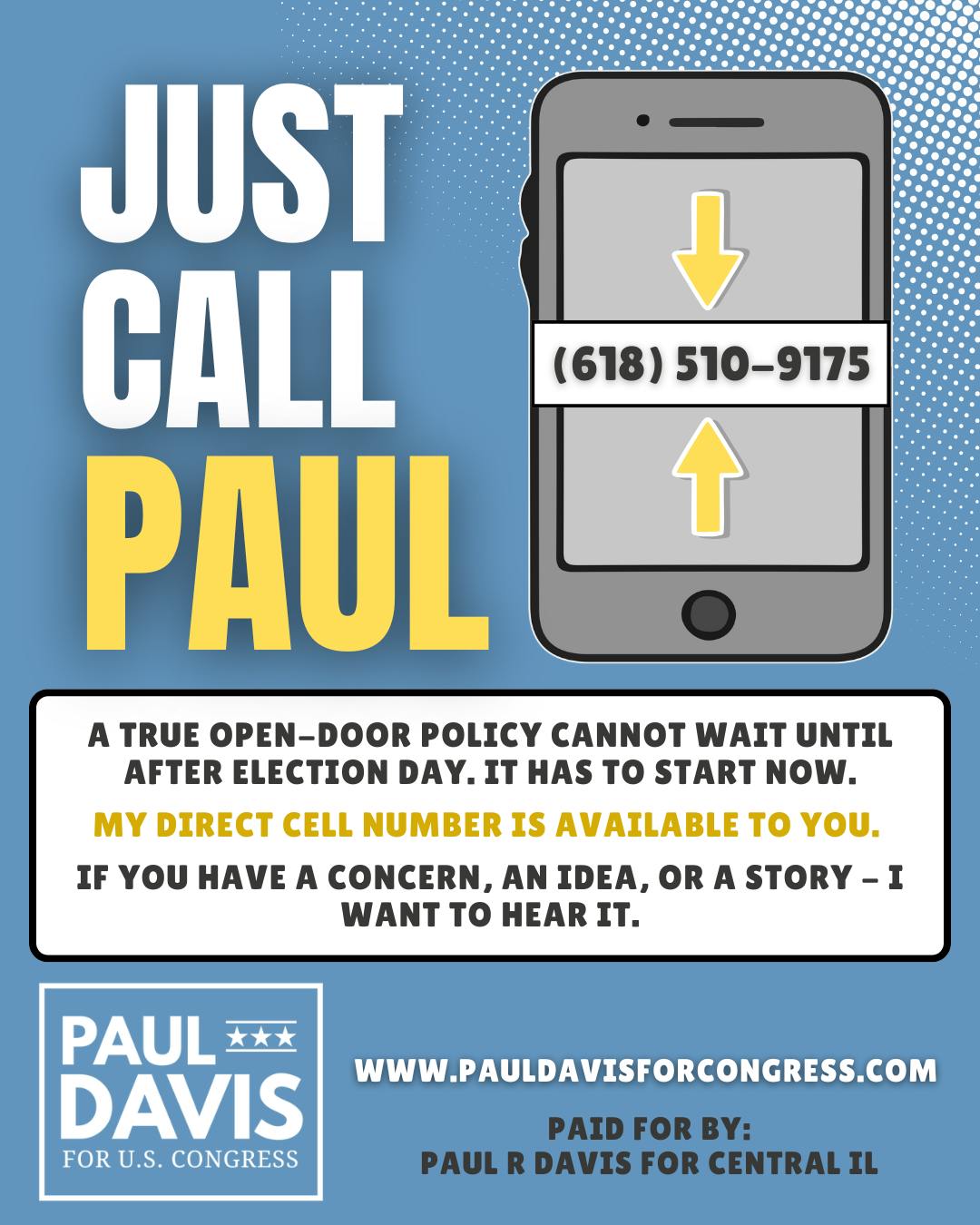 Starting today, I am making my personal cell phone number available to you. If you have a concern, an idea, or a story you want your potential Representative to hear, I want to hear it.